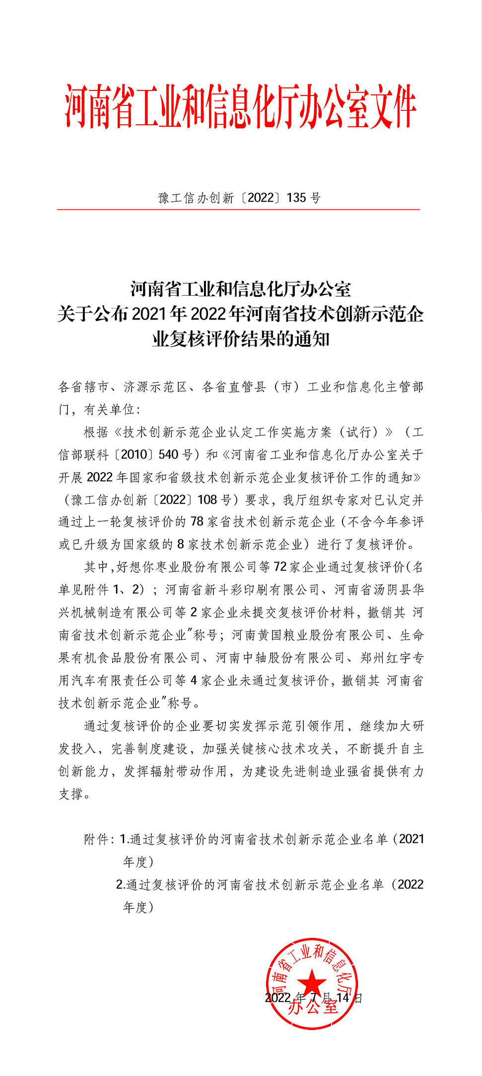 7月14日,河南省工業和信息化廳辦公室公布《關于公布2021年2022年河南省技術創新示范企業復核評價結果的通知》,我公司成功通過2022年復核評價。